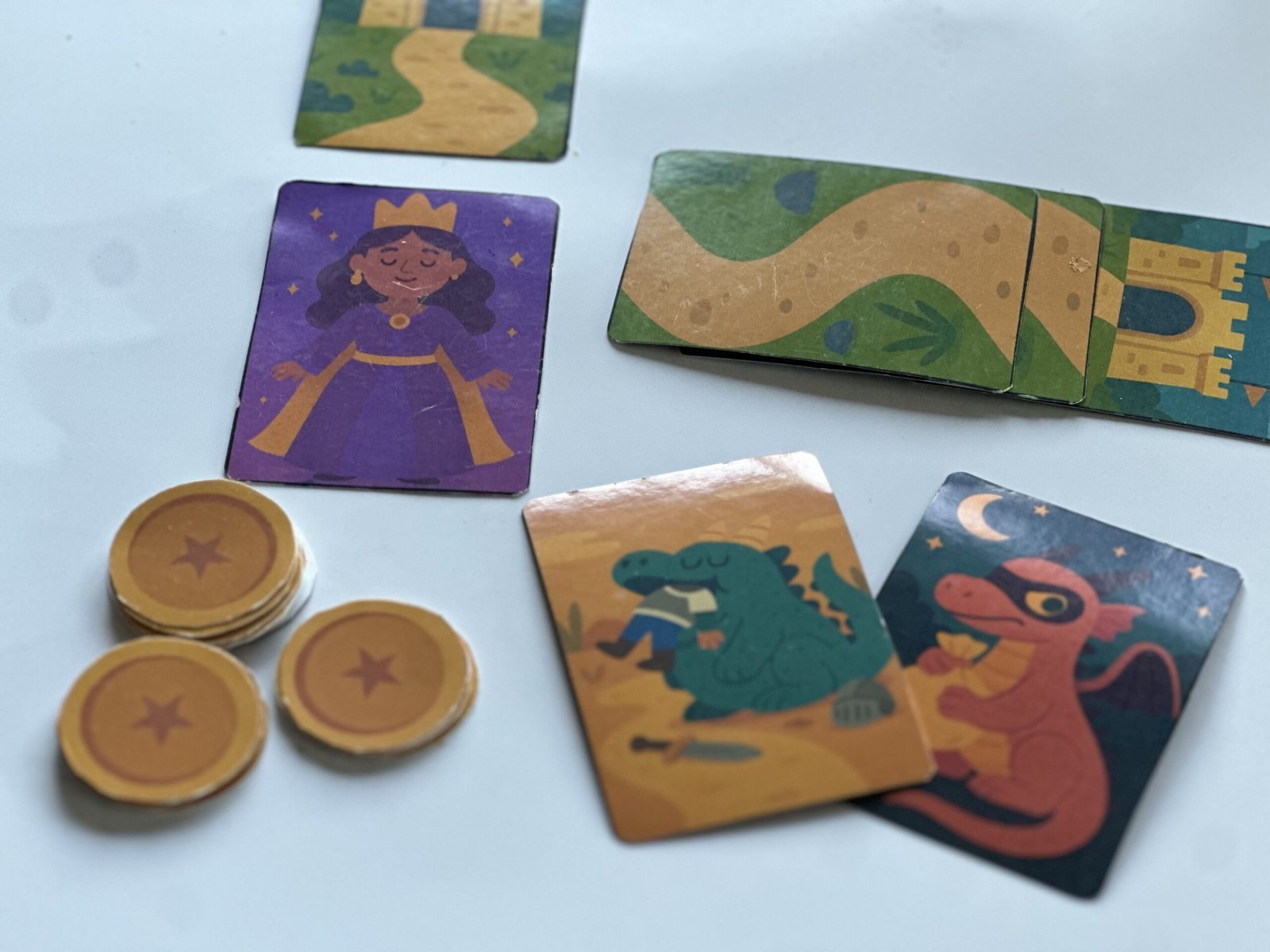 משחק הרפתקה משפחתי, מצחיק ומותח! עזרו לדמויות המלכותיות למצוא את דרכן לטירות, אספו מטבעות, התחמקו מדרקונים שובבים, והשתמשו באבירים להגנה! משחק קלפים שמשלב מזל, אסטרטגיה וצחוק לכל המשפחה.